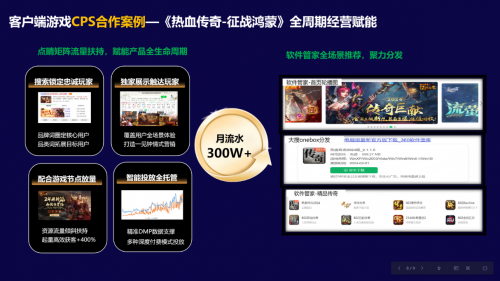 如果说凭借游戏预约功能,360软件管家能够有效缓解客户端游戏在下载、安装环节用户流失的压力。那么通过开放CPC、CPS、CPT、CPA等多元化的联运合作模式,360智慧商业也将满足客户端游戏在全域推广、持续增长、拉新、个性化投放等全生命营销周期不同阶段的营销需求。