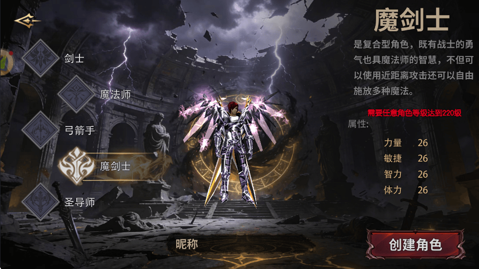 魔剑士需账号内任意角色达到220级解锁,兼具物理与魔法双重伤害。可同时装备剑士与魔法师武器,近战远程无缝切换,针对不同职业切换输出形态,在1v1竞技、小型团战收割中优势明显。不过,其搬砖效率中等,需搭配高爆率地图定点刷宝。