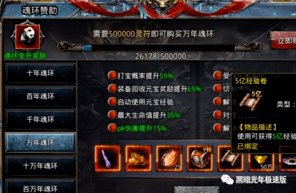 百年魂环(100元):获取永久打金卡,享有永久自动回收功能,并附带4转属性。